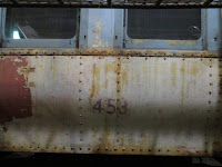 Today I decided to see how it works on the lower side of the car. Very little of the side is accessible because of the shelves in the scaffolding, but here's one section. I verified that Frank had indeed traced this particular number, and then started with the needle chipper.