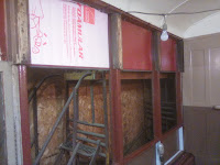 Earlier in the week, the upper areas above windows 15 through 17 had the insulation applied. Two of them have the sheet metal covering over the 'pink panther' insulation. More panels are being prepared for the rest of windows.